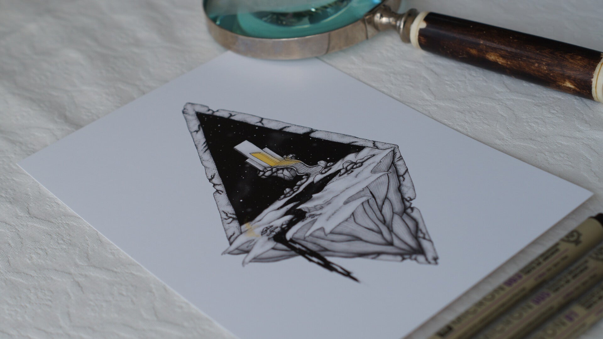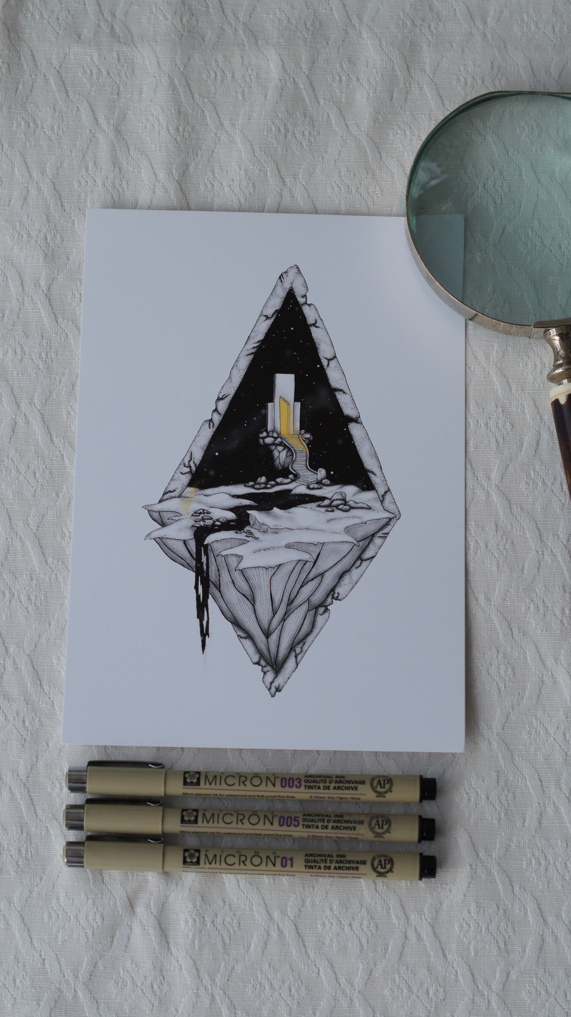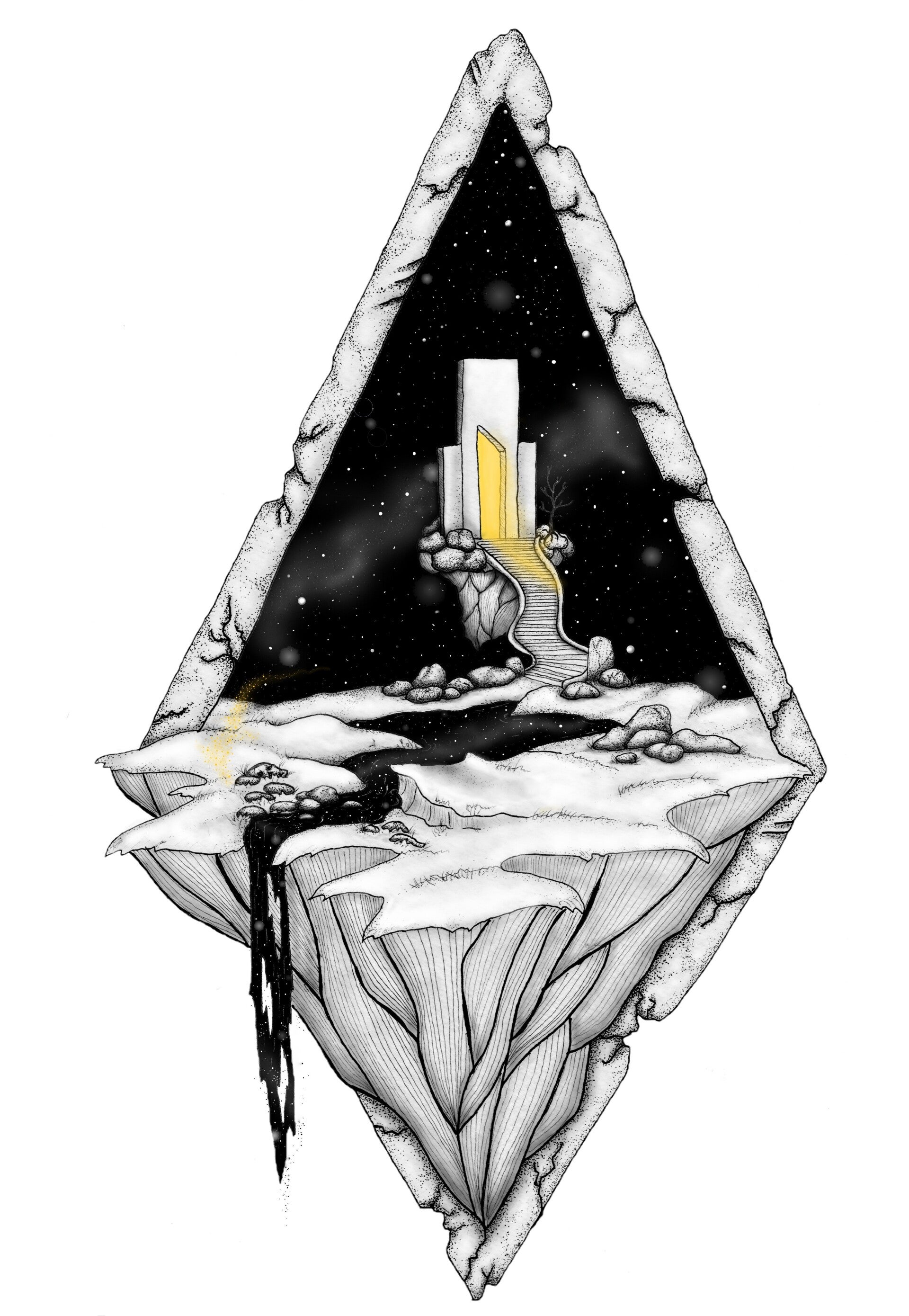This artwork, created using the patient and intricate stippling technique, takes you on a journey. Inspired by the imaginative album covers of rock bands like Deep Purple and Uriah Heep, as well as the epic sense of adventure found in Dungeons & Dragons, the piece depicts a mysterious portal.