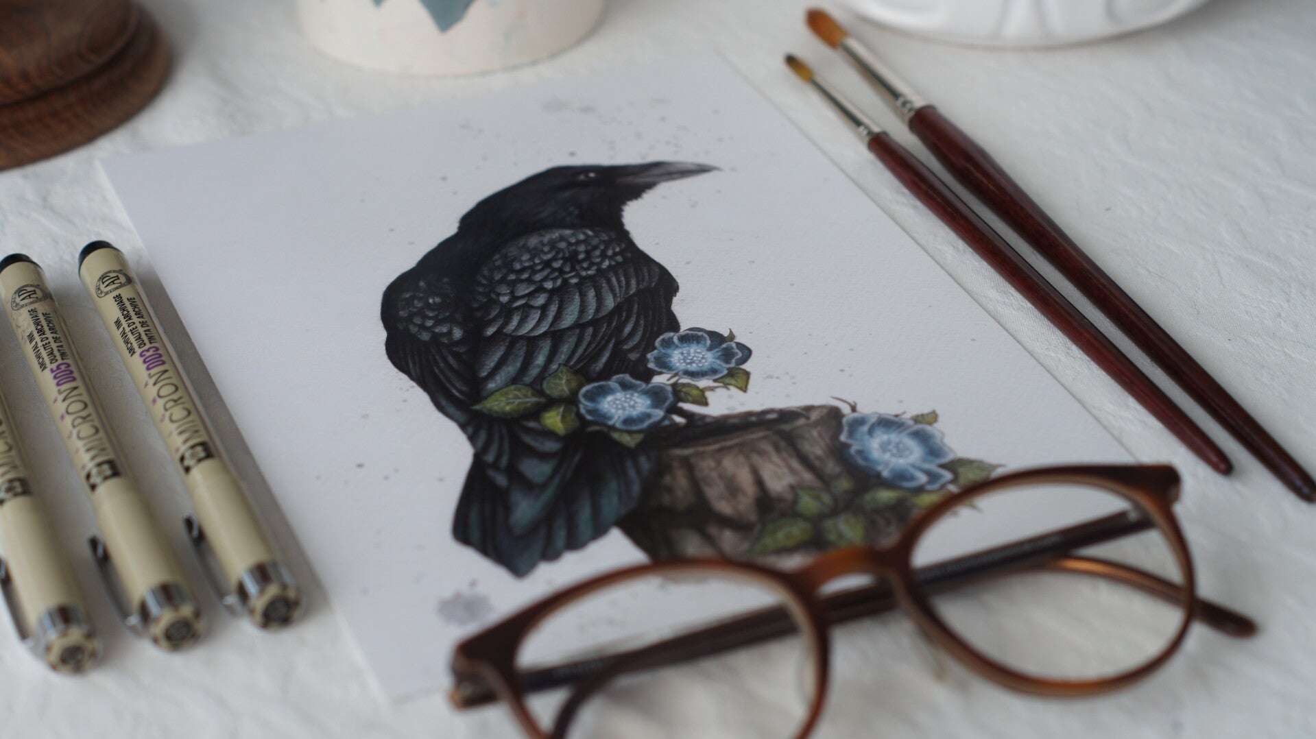 This watercolor painting, enhanced with fine details from a Micron ink pen, captures the mystical elegance of a raven resting on an old tree stump, surrounded by delicate forget-me-not flowers in shades of blue. The dark bird stands in striking contrast to the soft hues around it, while the gentle watercolor splashes add a dreamlike, almost magical atmosphere. The inspiration for this piece came spontaneously—I was scrolling through ideas when I stumbled upon an image of a bird. In that moment, I just knew this was what I wanted to paint. Sometimes, a first impression is all it takes to spark creativity!