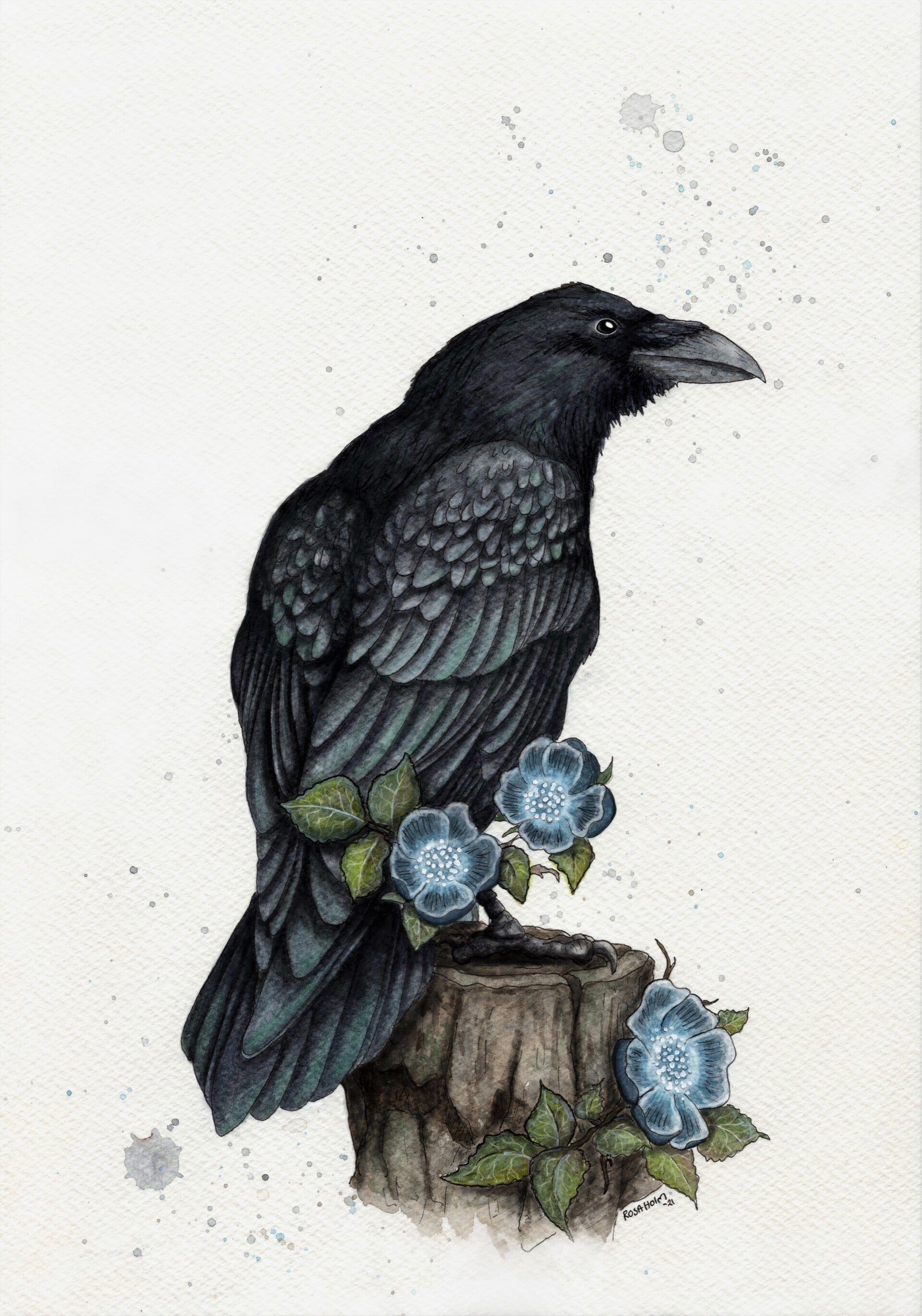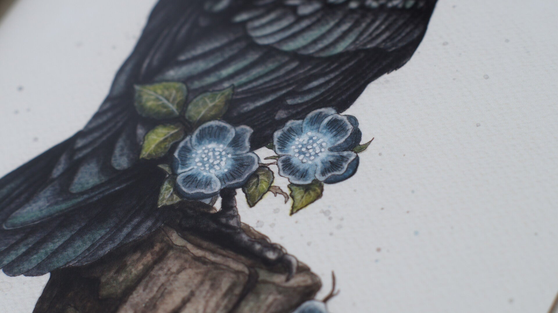 Denne akvarellen med Micron ink-pen fanger den mystiske skjønnheten til en ravn som hviler på en gammel trestubb, omgitt av sarte forglemmegei-blomster i blåtoner. Den mørke fuglen står i vakker kontrast til de delikate fargene rundt den, og de lette akvarellflekker gir bildet en drømmende, litt magisk stemning.
