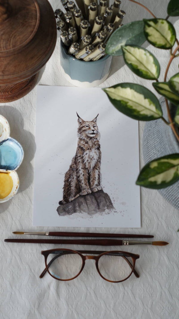 Med en vellykket balanse mellom realisme og en anelse tegneserieaktig sjarm, er gaupen fremstilt sittende stolt og oppmerksomt på en solid stein. De karakteristiske øreduskene og det intense blikket er nøye gjengitt, og fanger essensen av dette sky og grasiøse rovdyret. Pelsens detaljer, med sine unike flekker og mønstre, er vakkert fremhevet gjennom akvarellens myke overganger og blekkets fine linjer.
