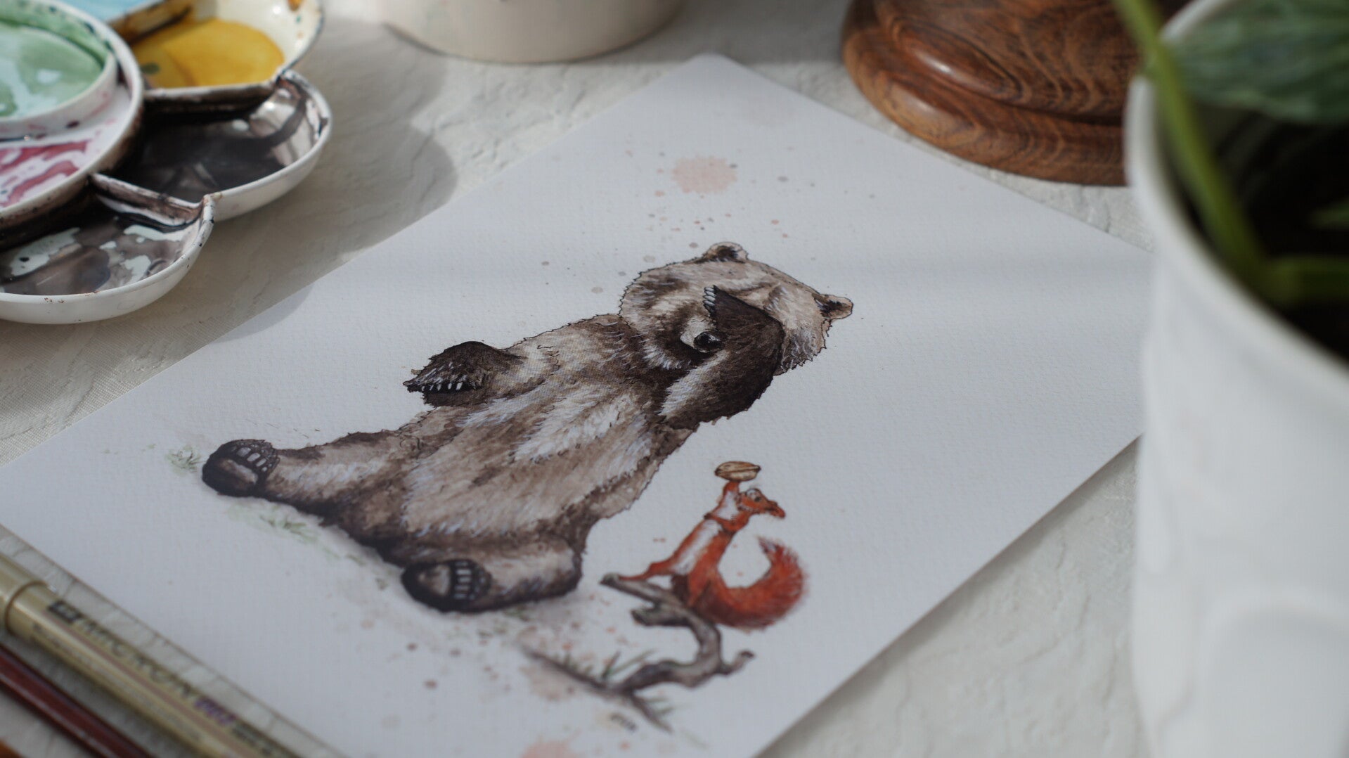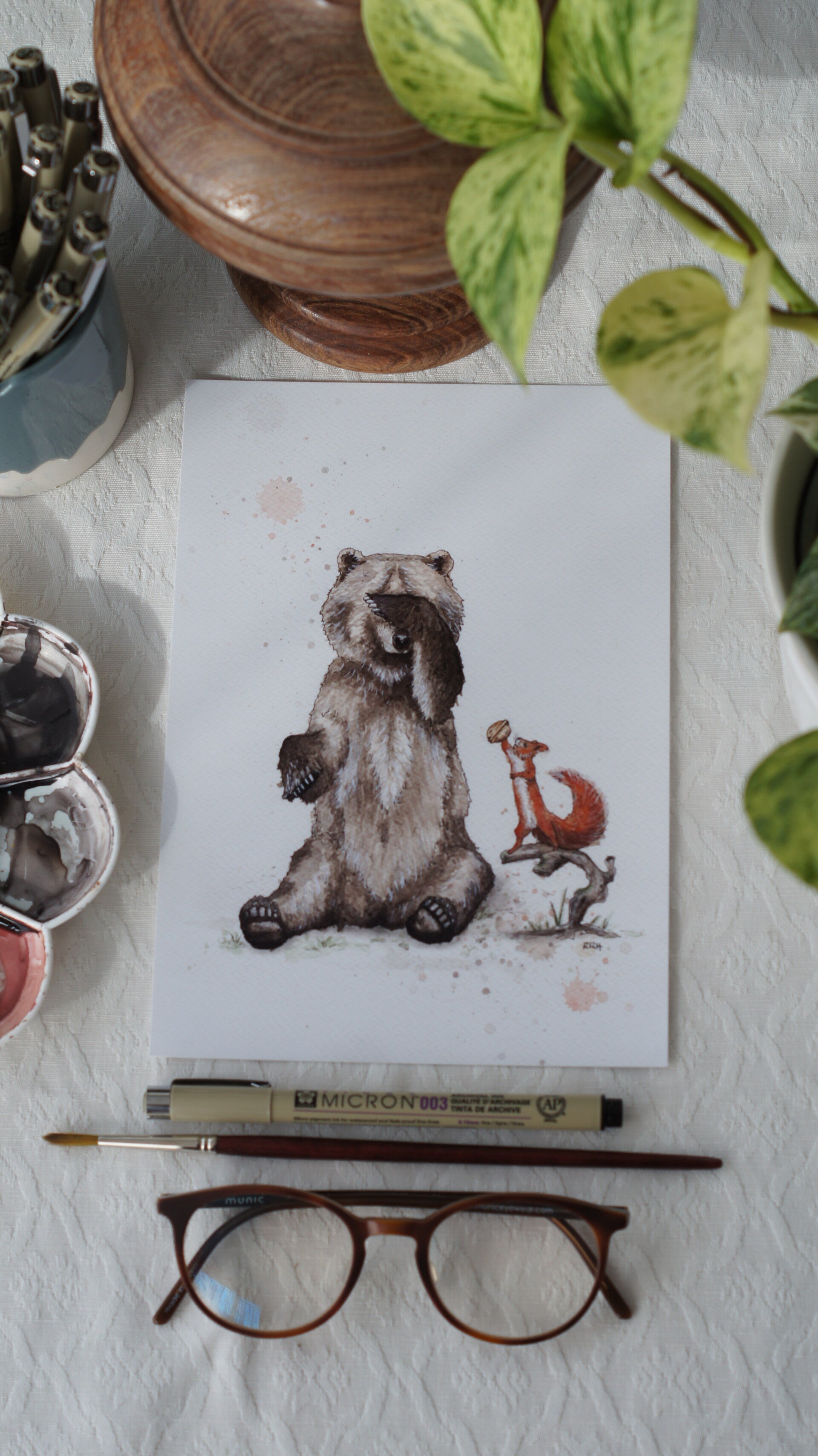 This charming watercolor painting, enhanced with fine details from a Micron ink pen, captures a heartwarming interaction between two of the forest’s most lovable creatures. With a unique blend of realism and cartoon-style, the artwork is filled with both depth and playfulness. The title "Across Sizes" highlights the sweet dynamic of the scene. At the center stands a large, cuddly bear, seemingly caught in a moment of shyness or wonder, with one paw raised to its face. Beside it, perched on a small branch, is an eager little squirrel, proudly presenting a nut—a gesture that perfectly embodies the "Across Sizes" theme. The contrast between the big bear and the tiny squirrel, along with the oversized nut, creates a touching and humorous dynamic. The watercolor technique lends the painting a soft and dreamy quality, while the Micron ink pen details add precision and definition to the animals’ fur, facial expressions, and surroundings. Subtle splashes of color in the background give the piece a fresh and artistic finish. This artwork is a celebration of friendship, generosity, and the unexpected connections that can form in nature—regardless of size. A sweet and heartwarming piece that will bring joy to any space.