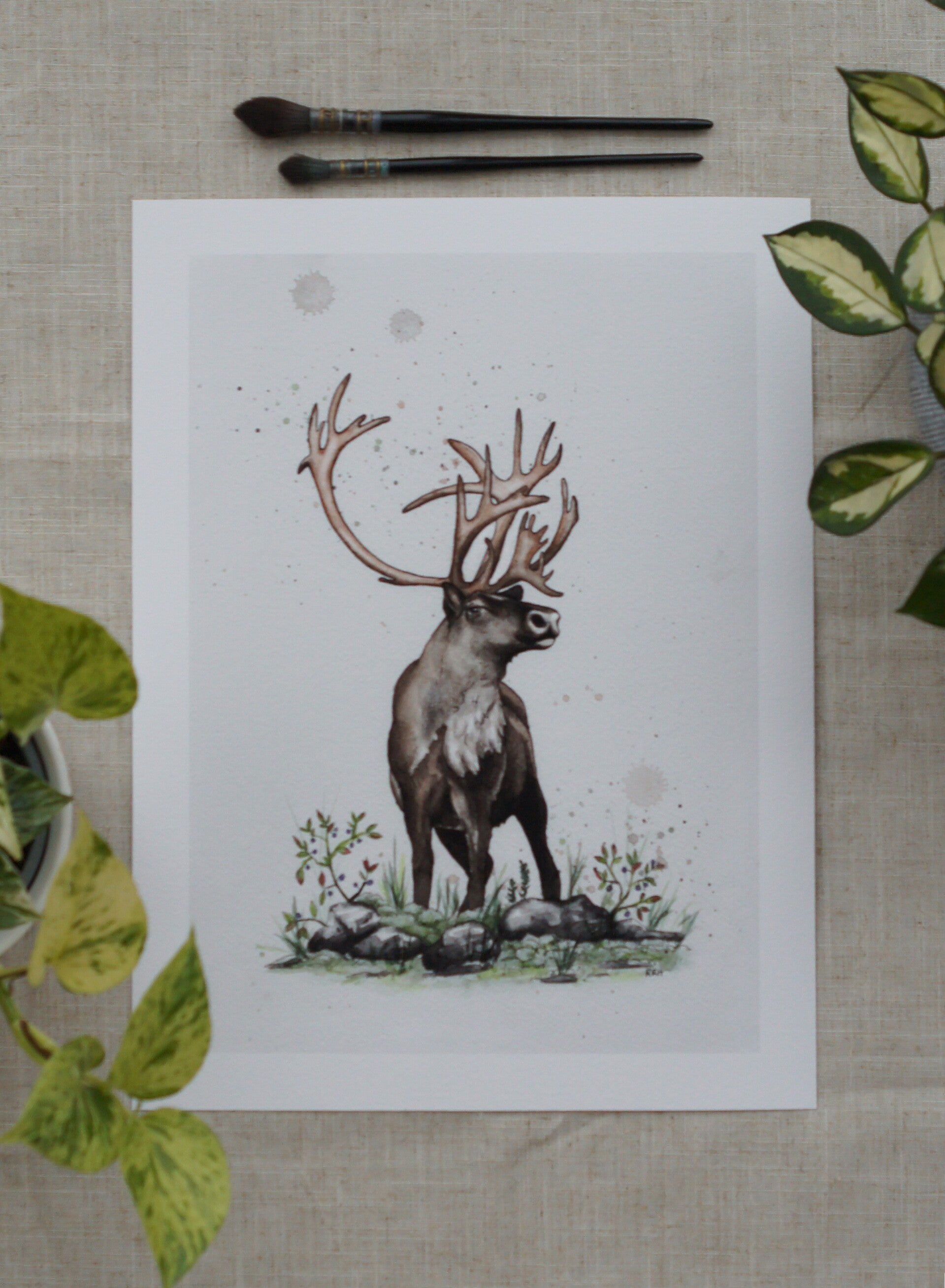 The drive across Kvaløya in Troms was breathtaking, with mountains reflecting in the sea. Then, along the road, I spotted a whole herd of reindeer grazing peacefully. But my eyes were drawn to one special reindeer. He stood alone on a small moss-covered hill, surrounded by blueberry shrubs. He was majestic and grand, with an impressive set of antlers. I stopped the car a little farther away to avoid disturbing them and took the chance to snap a few photos. Even from a distance, he was a powerful sight, standing like a king in his domain. For a moment, time seemed to stand still as I captured the image of this magnificent reindeer in the stunning landscape. Later, I used this moment as inspiration to create a watercolor painting.
