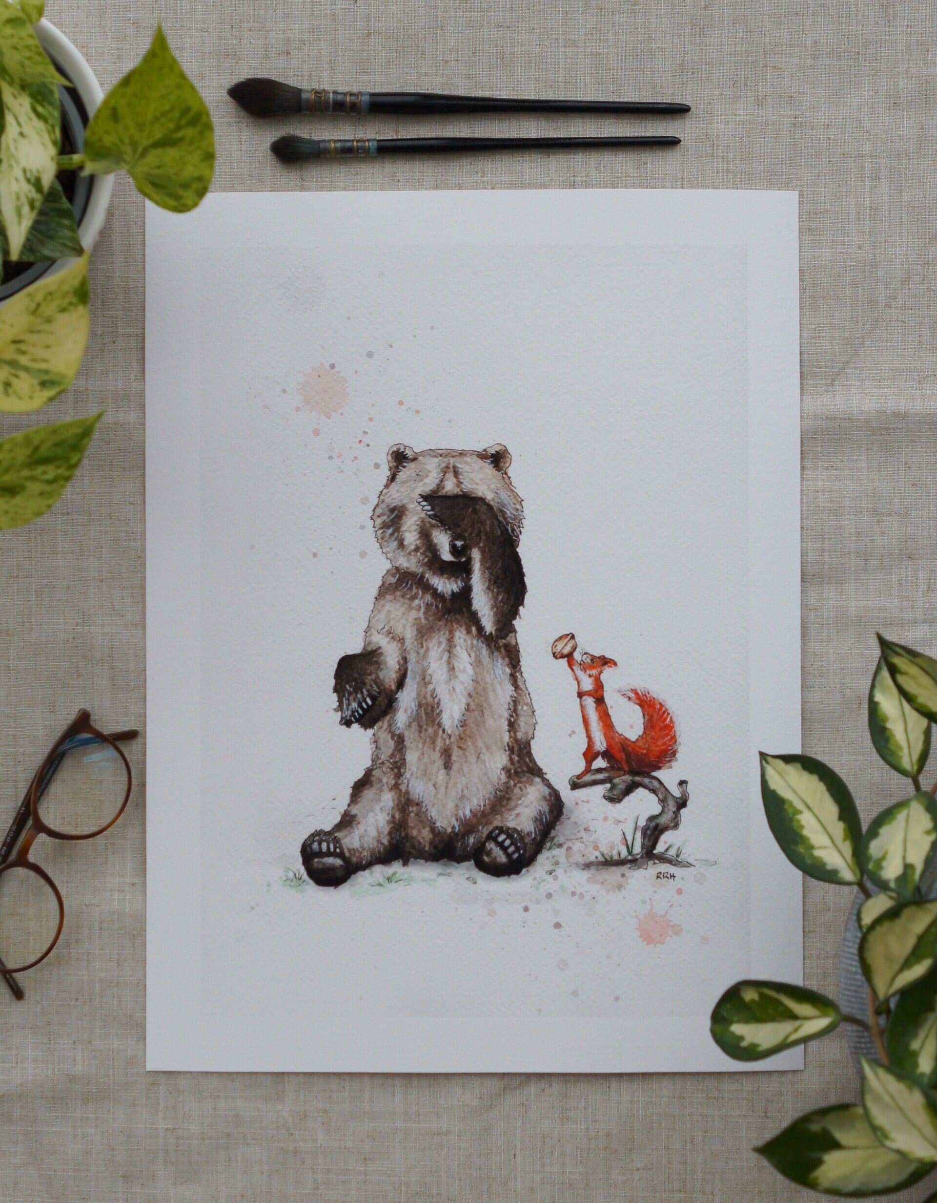 This charming watercolor painting, enhanced with fine details from a Micron ink pen, captures a heartwarming interaction between two of the forest’s most lovable creatures. With a unique blend of realism and cartoon-style, the artwork is filled with both depth and playfulness. The title "Across Sizes" highlights the sweet dynamic of the scene. At the center stands a large, cuddly bear, seemingly caught in a moment of shyness or wonder, with one paw raised to its face. Beside it, perched on a small branch, is an eager little squirrel, proudly presenting a nut—a gesture that perfectly embodies the "Across Sizes" theme. The contrast between the big bear and the tiny squirrel, along with the oversized nut, creates a touching and humorous dynamic. The watercolor technique lends the painting a soft and dreamy quality, while the Micron ink pen details add precision and definition to the animals’ fur, facial expressions, and surroundings. Subtle splashes of color in the background give the piece a fresh and artistic finish. This artwork is a celebration of friendship, generosity, and the unexpected connections that can form in nature—regardless of size. A sweet and heartwarming piece that will bring joy to any space.
