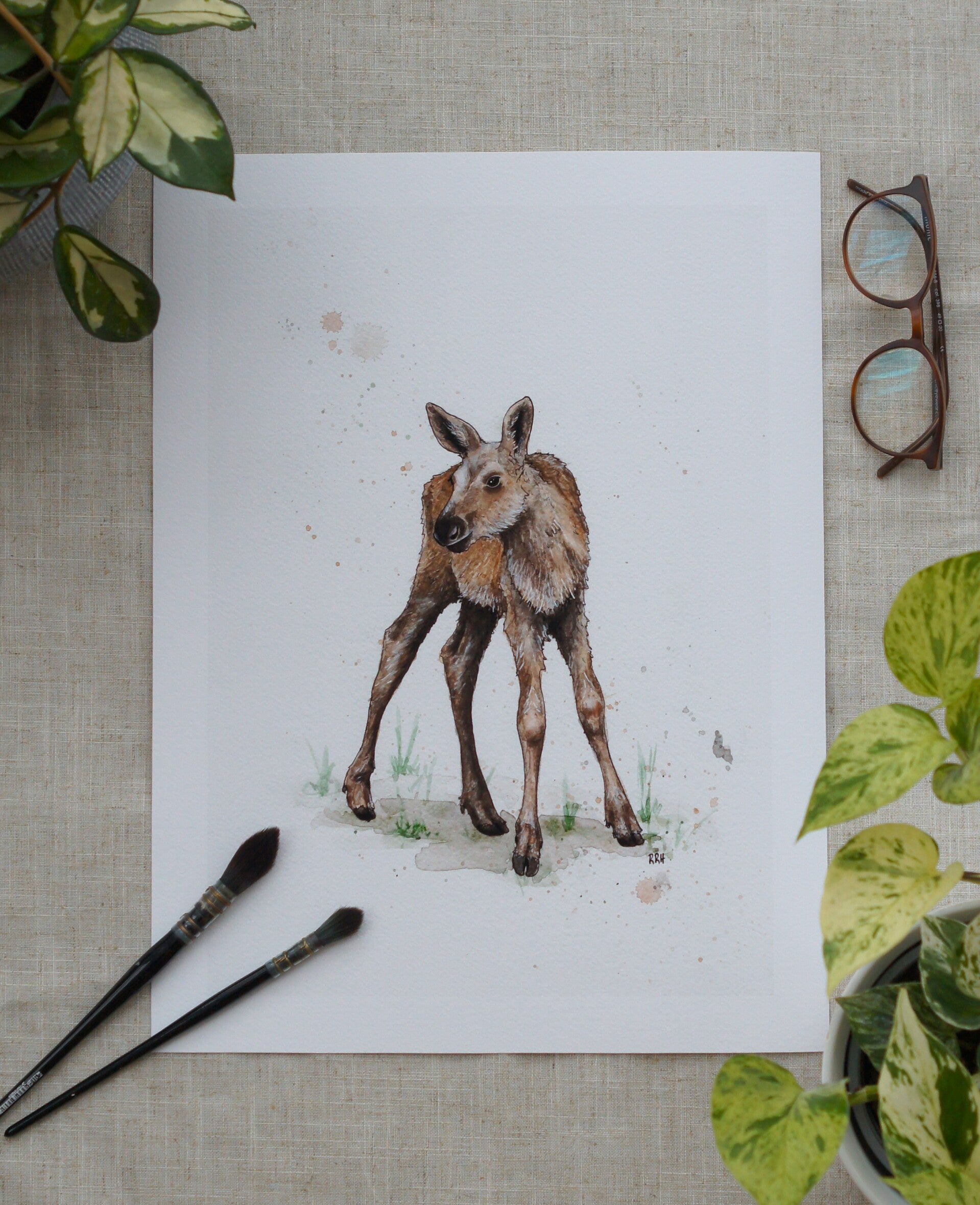 Denne illustrasjonen fanger den sjeldne og hjertevarmende elgkalven i en stil som balanserer mellom realisme og tegneserie. Skapt med akvarell og Micron ink-penn, gir de myke fargene og fine detaljene liv til den unge elgen – med sine lange, litt klumsete ben og et spørrende blikk som utstråler nysgjerrighet.