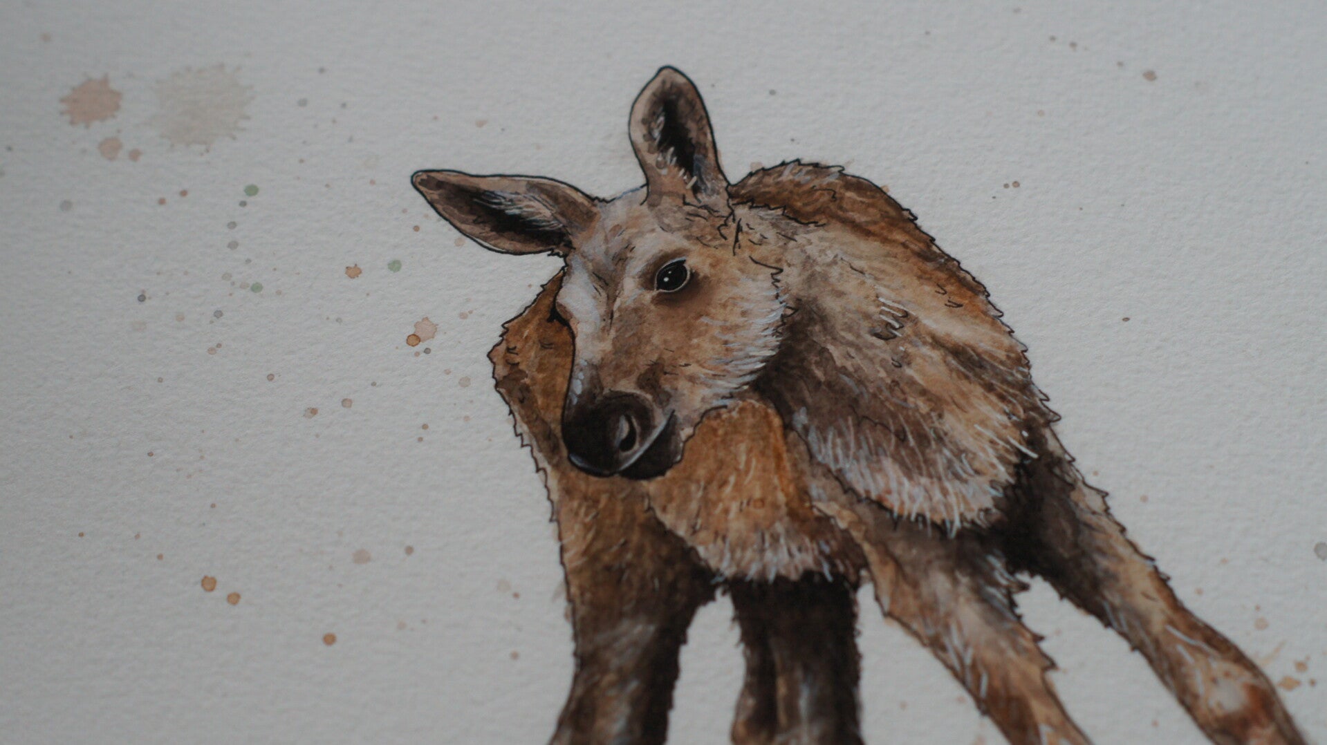 This illustration captures the rare and heartwarming presence of a moose calf, blending realism and a touch of cartoon-like charm. Created with watercolor and Micron ink pen, the soft colors and fine details bring the young moose to life—with its long, slightly clumsy legs and an inquiring gaze that radiates curiosity. The inspiration for this artwork came from a photo I took in a wildlife park, where I spotted a moose calf that truly caught my attention. There was something special about its expression—both cautious and curious at the same time—that made me want to preserve the moment in a drawing. I wanted to highlight the unique charm of the calf, a subject often overlooked in favor of the majestic bull moose. With this piece, I hope to give the moose calf the recognition it deserves and create a warm and cozy atmosphere.