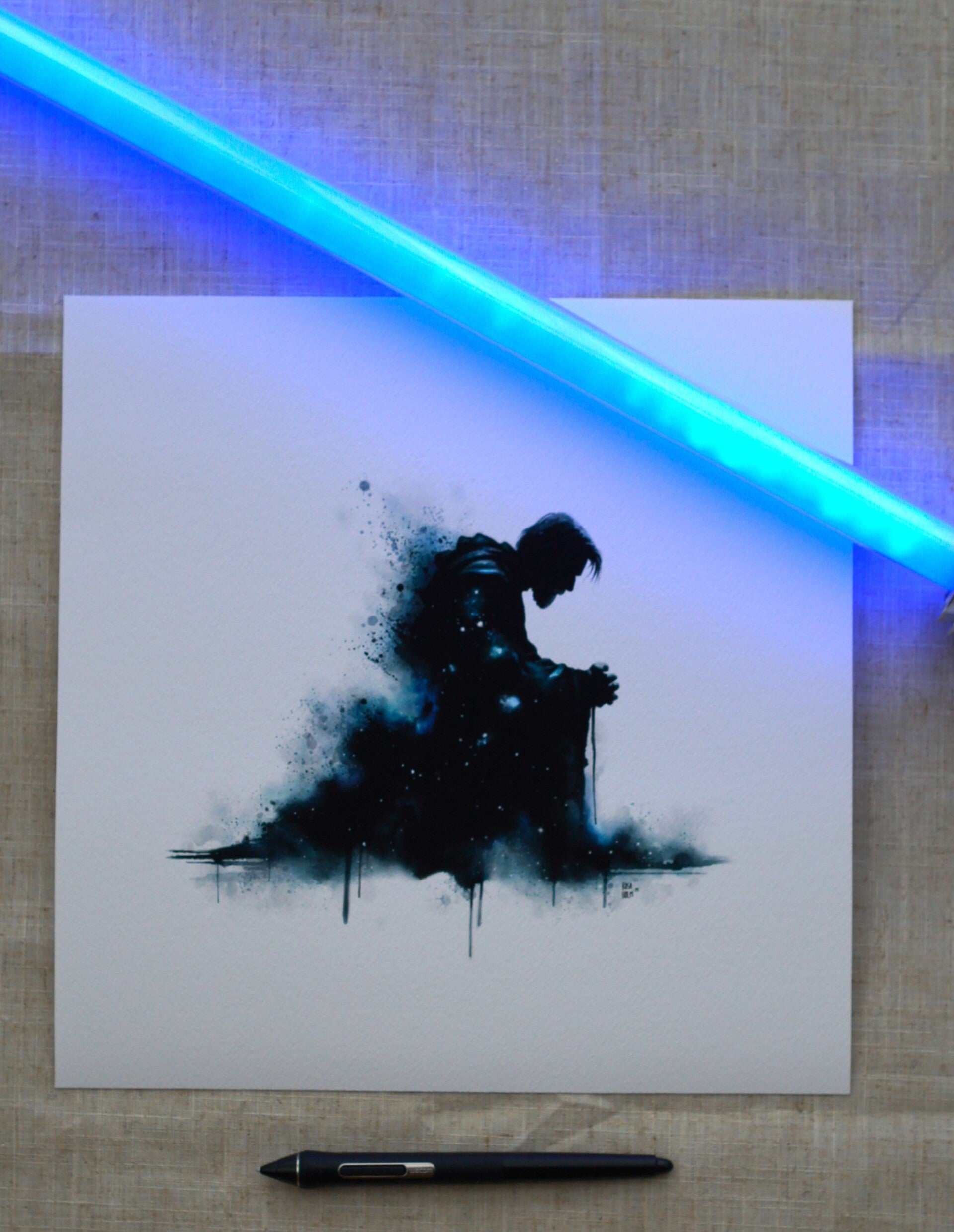 Denne kosmiske tåken kan tolkes som galaksens fall, Jedi-ordenens oppløsning eller Obi-Wans egen ensomhet. Akvarellteksturen gir bildet en drømmende, nesten eterisk kvalitet, som understreker øyeblikkets flyktighet og dybde.